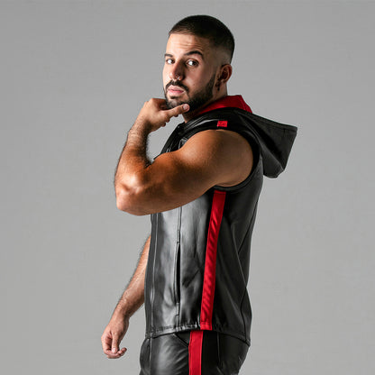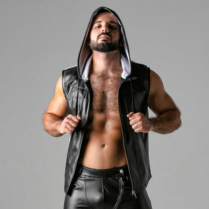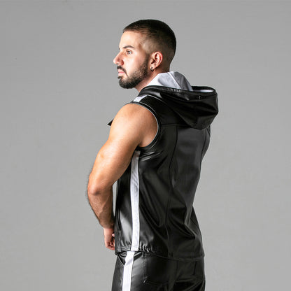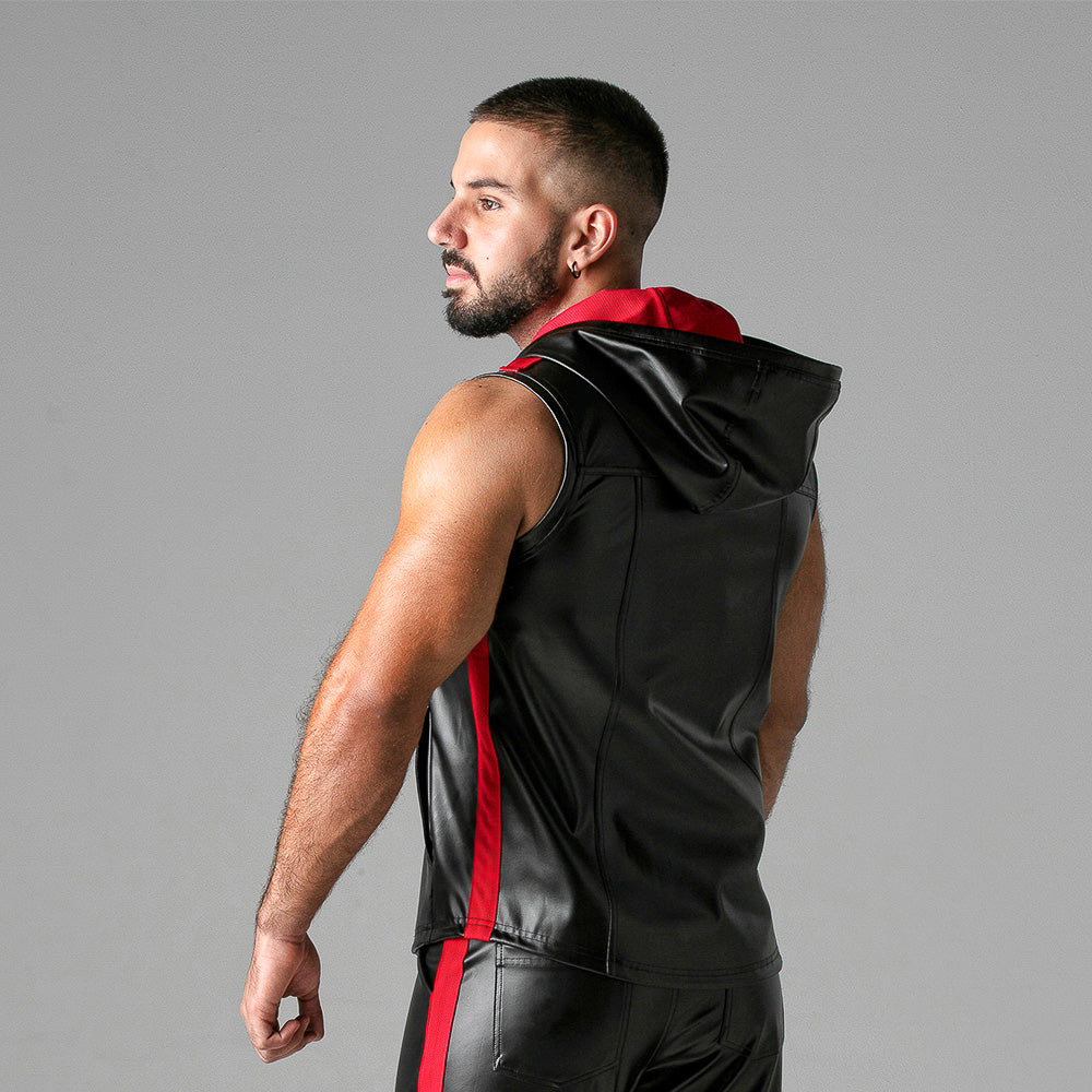 Sleeveless hoody, made from the finest leatherette stretch fabric.